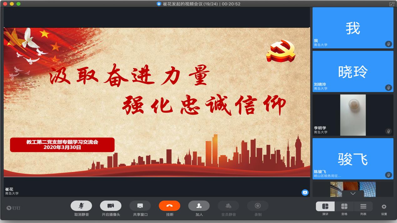 320日下午,Beat365唯一官方网站教工第二党支部利用钉钉视频会议召开了汲取奋进力量,强化忠诚信仰专题视频学习交流会。会议由教工第二党支部书记崔花主持,Beat365唯一官方网站党委书记王传永及二支部教师党员参加会议。与会党员认真开展了政治理论学习,并结合疫情期间网上授课的经验和体会,对“开展网络思政、强化爱国主义教育、强化对党、对国家的忠诚信仰”等方面内容进行了交流讨论。