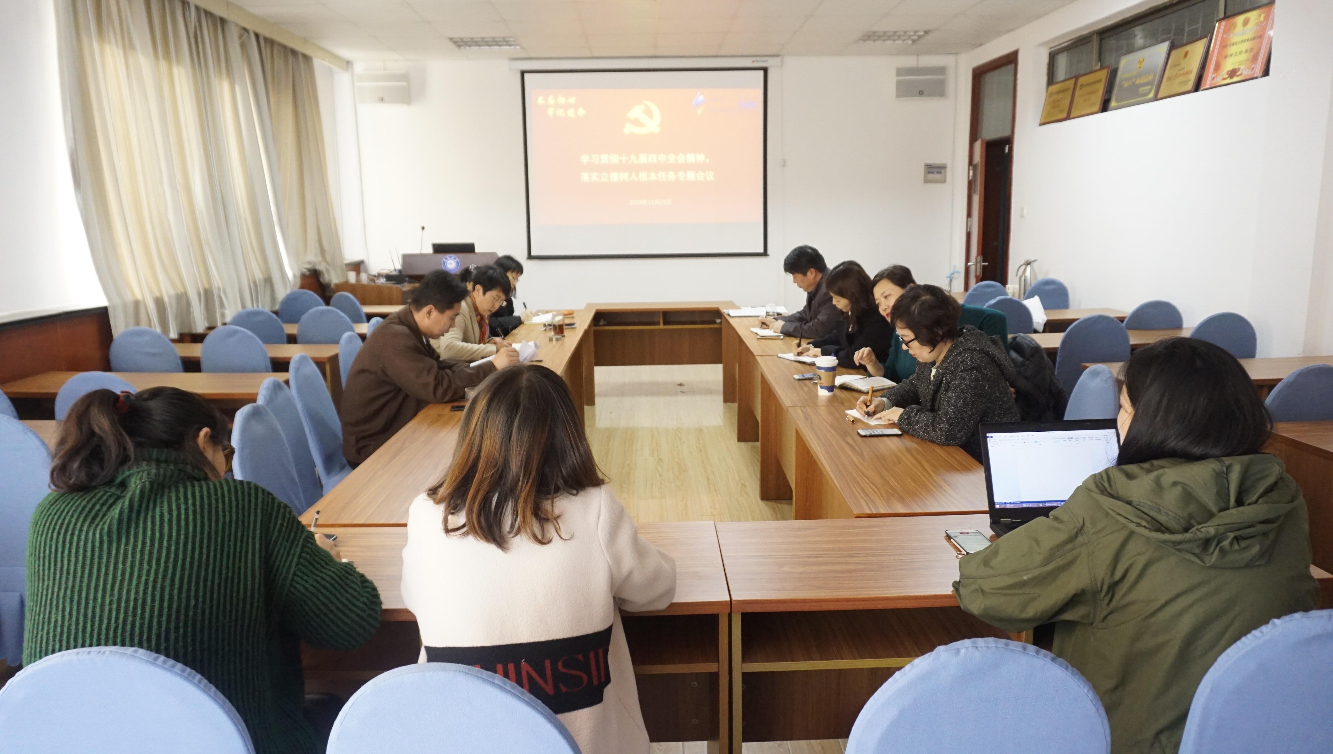 11月21日下午,Beat365唯一官方网站党委理论中心组围绕“学习贯彻十九届四中全会精神,落实立德树人根本任务”专题进行“不忘初心、牢记使命”主题教育第四次集中学习研讨。院党委书记王传永主持学习会。院党委领导班子、各支部书记、各办主任、全体辅导员参加了学习研讨。