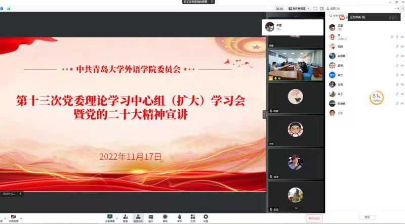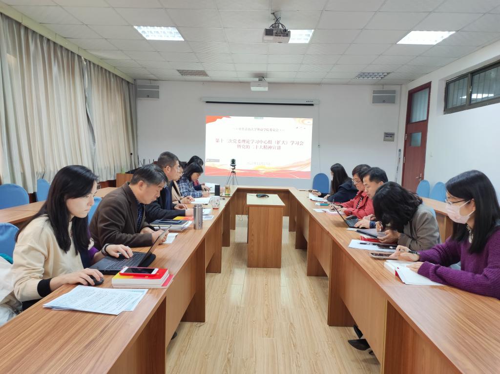 周伟在总结发言中强调,党的二十大报告为新时代新征程党和国家事业发展、实现第二个百年奋斗目标指明了前进方向、确立了行动指南。学院全体教职员工要深入学习、认真领会党的二十大精神,要将党的二十大精神融入立德树人全过程,融入学院“十四五”发展全过程,要进一步统一思想、凝聚共识,充分认识新时代新征程学院发展的机遇和挑战,紧紧围绕学科专业建设、人才培养、师资队伍建设、科学研究、服务地方、国际交流与合作,积极探索在综合性大学中外语学科建设与发展的新路径,以实际行动推进学院高质量发展。