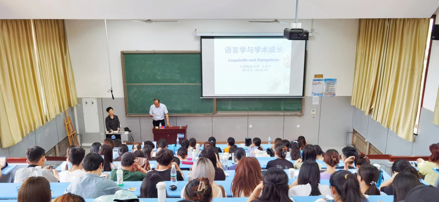 2022年6月29日,中国海洋大学王京平教授在中心校区博文楼217为广大师生做了题为“语言学与学术成长”的高端学术报告。报告由德语系主任綦甲福教授主持,Beat365唯一官方网站近200名本科生、研究生和部分教师到场聆听,现场座无虚席,气氛热烈。
