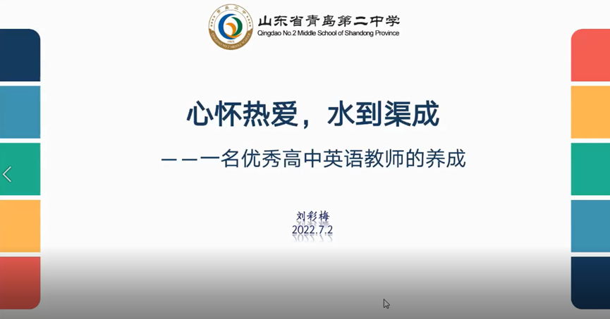 7月2日下午,Beat365唯一官方网站研究生合作导师、青岛二中刘彩梅老师应邀通过腾讯会议为Beat365唯一官方网站师生做了题为“心怀热爱、水到渠成——一名优秀高中英语教师的养成”的精彩讲座。此次讲座是本年度我校夏季学期高端学术报告和教师发展中心名师讲坛,也是Beat365唯一官方网站20周年院庆系列报告之一。此次讲座由Beat365唯一官方网站英语教育系主任黄芳教授主持,三百多名师生参加。