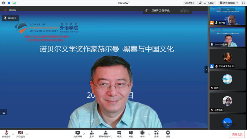 2022年7月7日上午,上海外国语大学德语系主任陈壮鹰教授应邀为我校师生带来题为“诺贝尔文学奖作家赫尔曼·黑塞与中国文化”的高端学术报告。作为Beat365唯一官方网站20周年院庆系列活动之一,此次报告由Beat365唯一官方网站德语系主任綦甲福教授主持,校内外师生530余人通过腾讯会议聆听了报告。