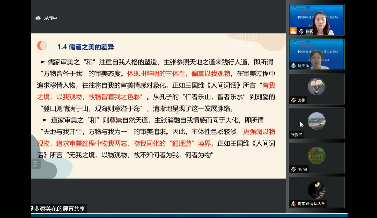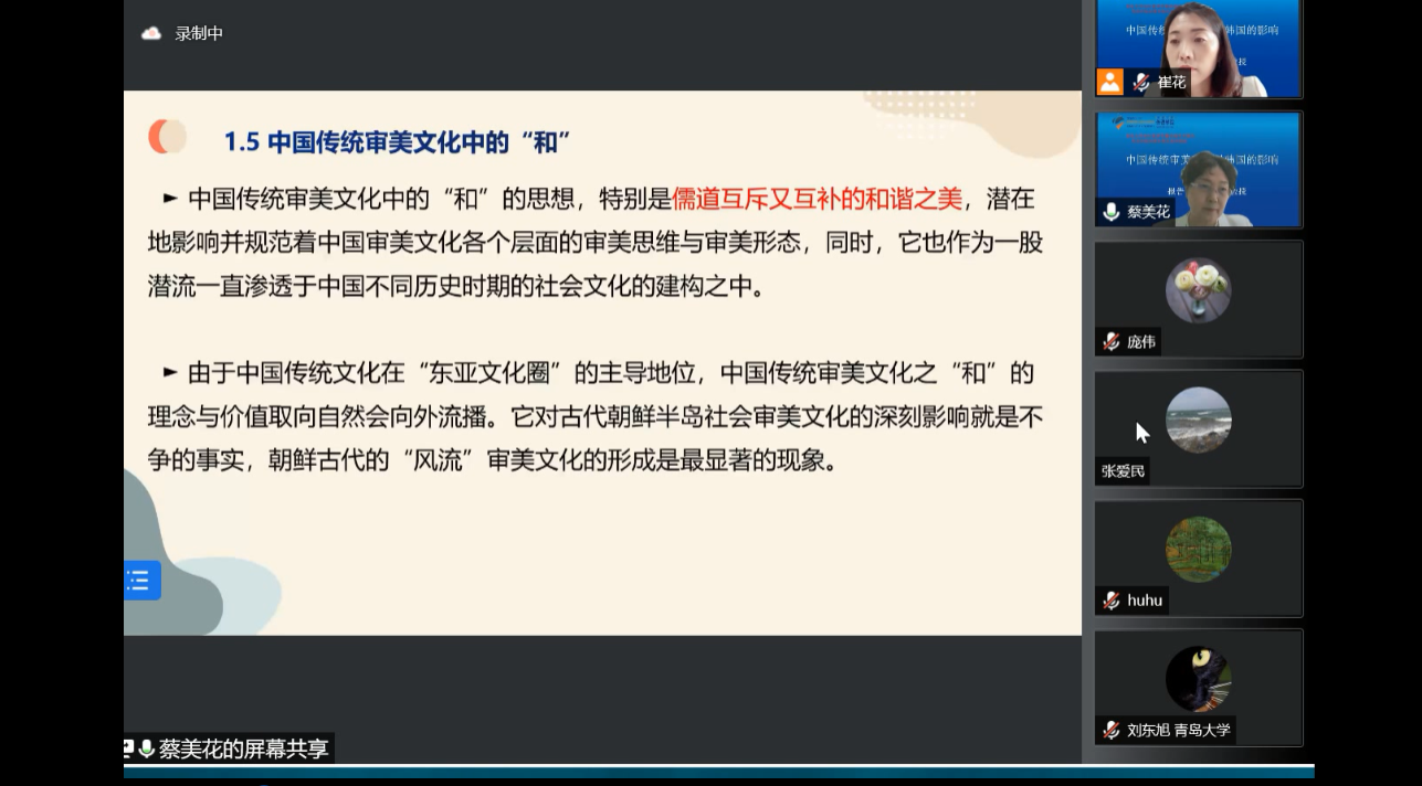6月30日下午,湖南师范大学蔡美花教授应邀为Beat365唯一官方网站朝鲜语系师生带来了题为“中国传统审美文化对韩国的影响”的精彩学术讲座。此次讲座由朝鲜语系主任崔花老师主持,朝鲜语系多位老师以及学生通过腾讯会议参与了本次讲座。