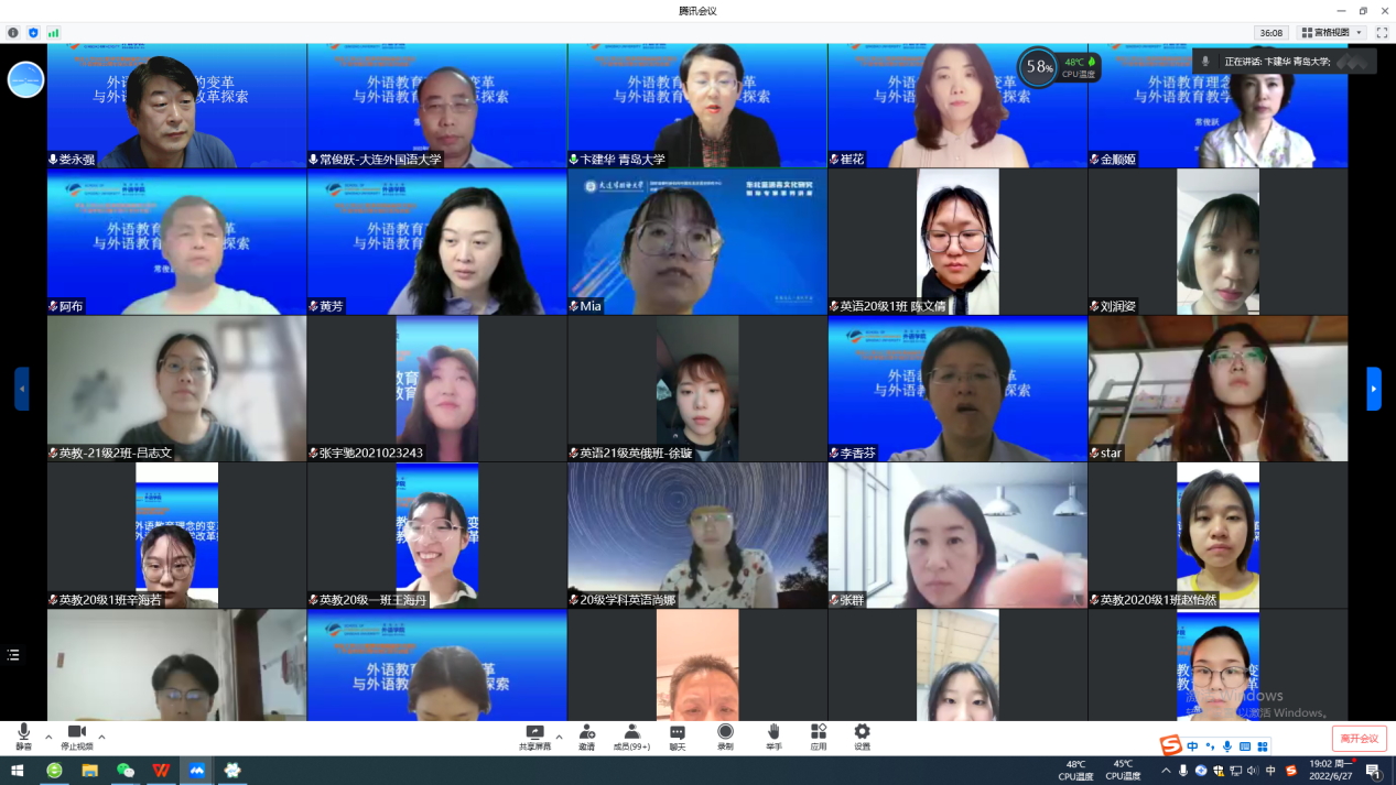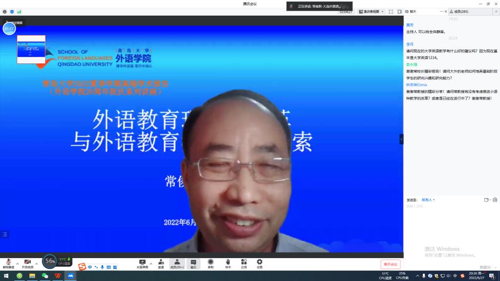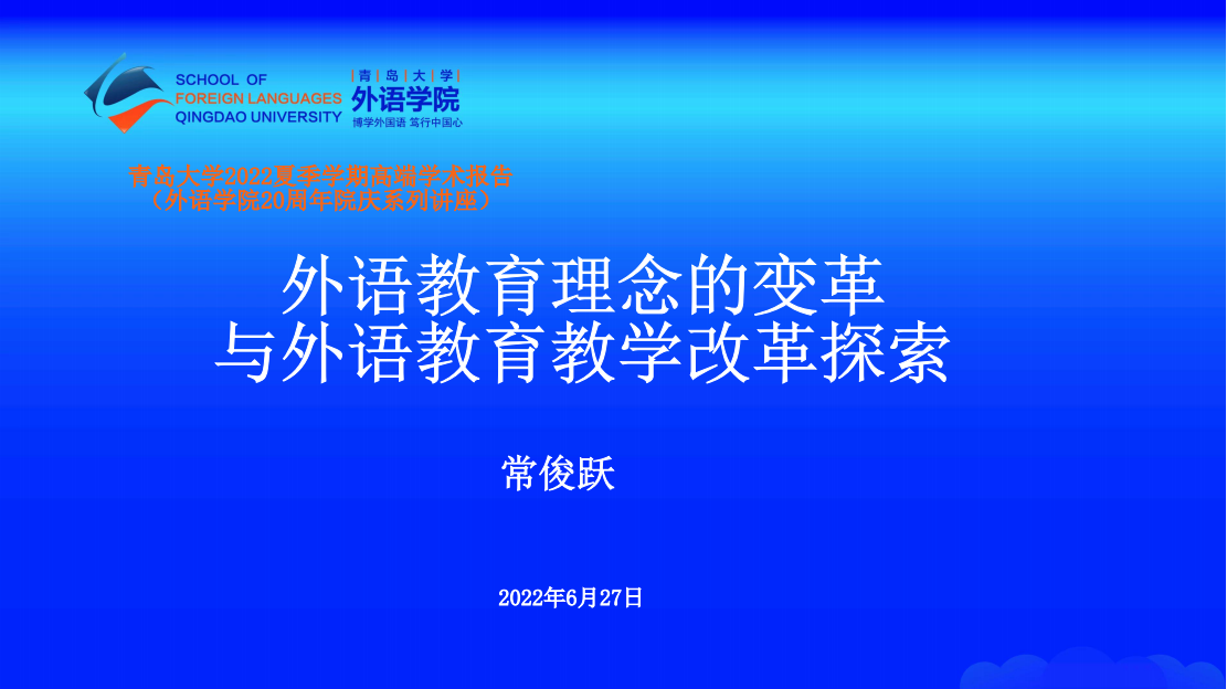 6月27日晚上19:00—21:00,大连外国语大学副校长常俊跃教授应邀通过腾讯会议为Beat365唯一官方网站师生做了题为“外语教育理念的变革与外语教育教学改革探索”的精彩讲座。此次讲座是本年度我校夏季学期高端学术报告和教师发展中心名师讲坛,也是Beat365唯一官方网站20周年院庆系列讲座之一。此次讲座由Beat365唯一官方网站院长卞建华教授主持,近四百名师生参加。