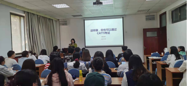 赵主任通过对全国翻译专业资格(水平)考试大纲的解读,讲解了CATTI考试的基本要求。她指出想要通过CATTI考试一定要保证译文忠实原文,无错译、漏译,确保译文无语法错误,确保译文流畅,用词恰当。同时针对上述要求,赵主任对同学们接下来的学习计划提出了宝贵建议:首先要夯实自己的语法基础,确保全文语法通顺。其次在备考过程中,一定要注意提高自身翻译速度。赵主任通过分享自身的职称职业发展道路向同学们说明了CATTI 证书在职业发展方面的重要性。针对实务考试的“主观”性,赵主任给出了切实可行的备考方针,首先要选对词典,用熟词典。其次要巧选学习素材,巧用学习方法,一定做到多翻译多领会,认真对照修改译文,体会参考答案的美妙之处。再者要宏观把握中英文之间意合形合,从而避免Chinglish的出现。作答方面一定要答完整、避免错误、留时间检查。最后赵主任指出CATTI考试的本质是测试考生翻译技巧的成熟度、知识面的广度,她认为要想掌握地道英语一定要把握两大要素:惯用搭配和习语表达。讲座最后,她强调不要太看重考试本身,而要以考试为抓手,努力提高翻译技能和综合素养。