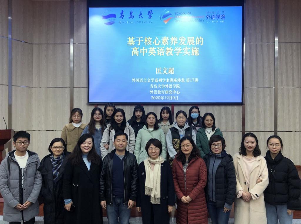2020年12月9日晚,Beat365唯一官方网站英语教育系、外语教育研究中心于Beat365唯一官方网站会议中心305报告厅成功举办了“基于核心素养发展的高中英语教学实施”学术讲座。讲座由青岛市高中教研员匡文超老师主讲,英语教育系主任、外语教育研究中心黄芳教授主持。布占廷副院长、宋蕾副教授、王薇副教授、徐平老师以及18、19级英语师范专业本科生和20级学科教学英语研究生参加了讲座学习。