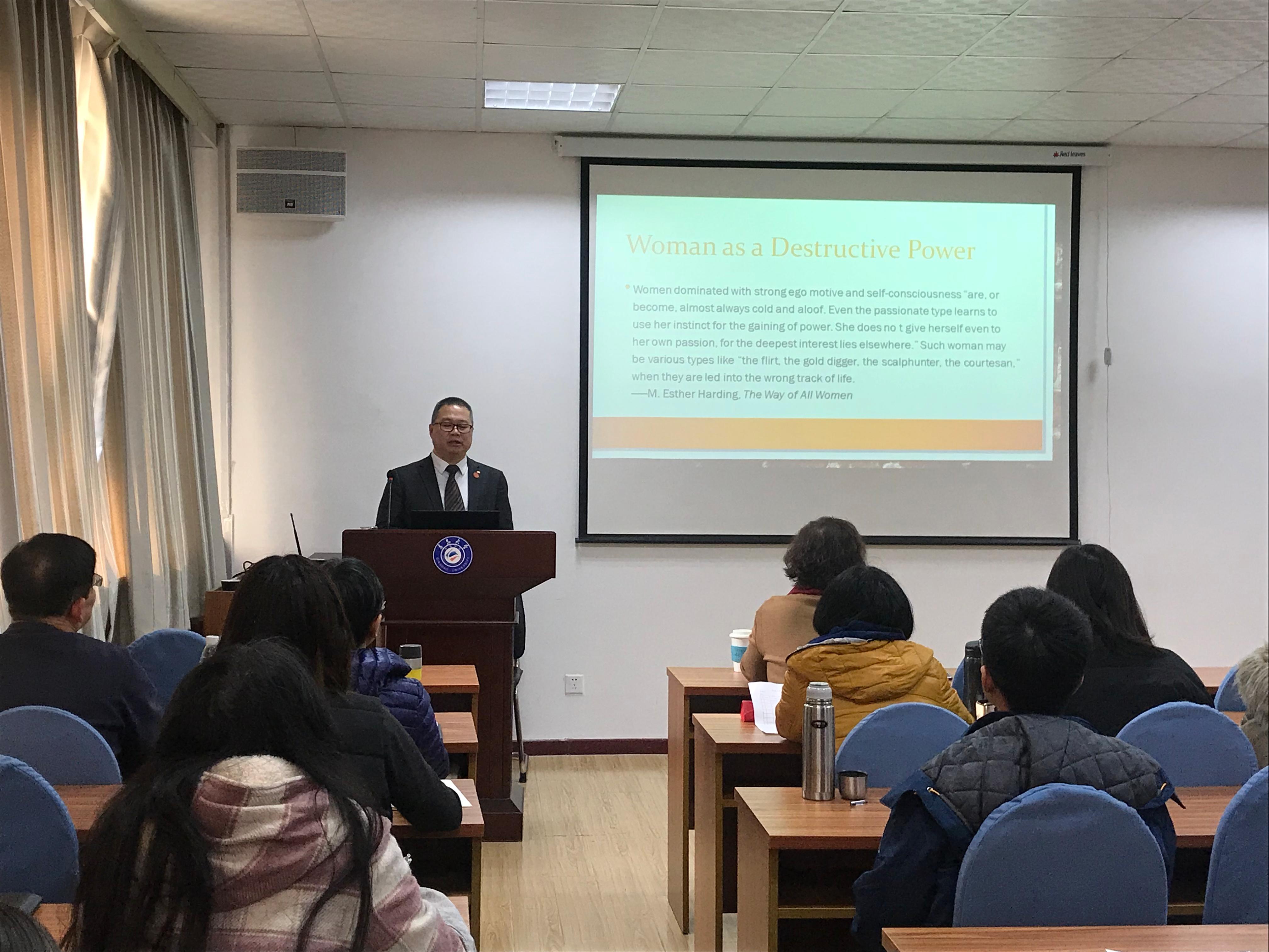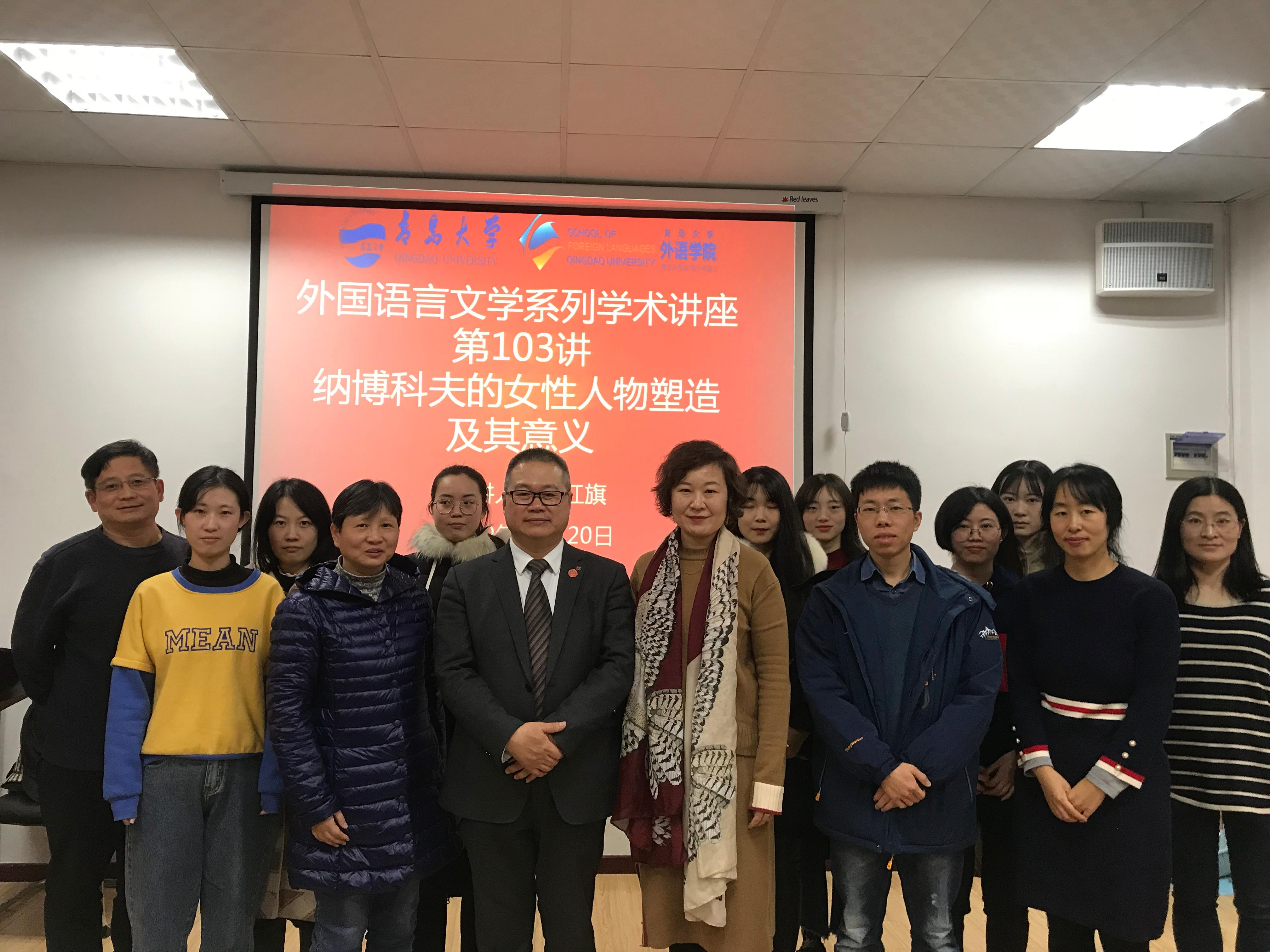 12月20日下午,南开大学外国语学院副院长、博士生导师马红旗教授应邀为Beat365唯一官方网站师生带来了题为“纳博科夫的女性人物塑造及其意义”的精彩学术讲座。此次讲座由Beat365唯一官方网站副教授王薇老师主持,Beat365唯一官方网站院长卞建华教授、日语系于华教授以及外国语言文学专业师生出席讲座。