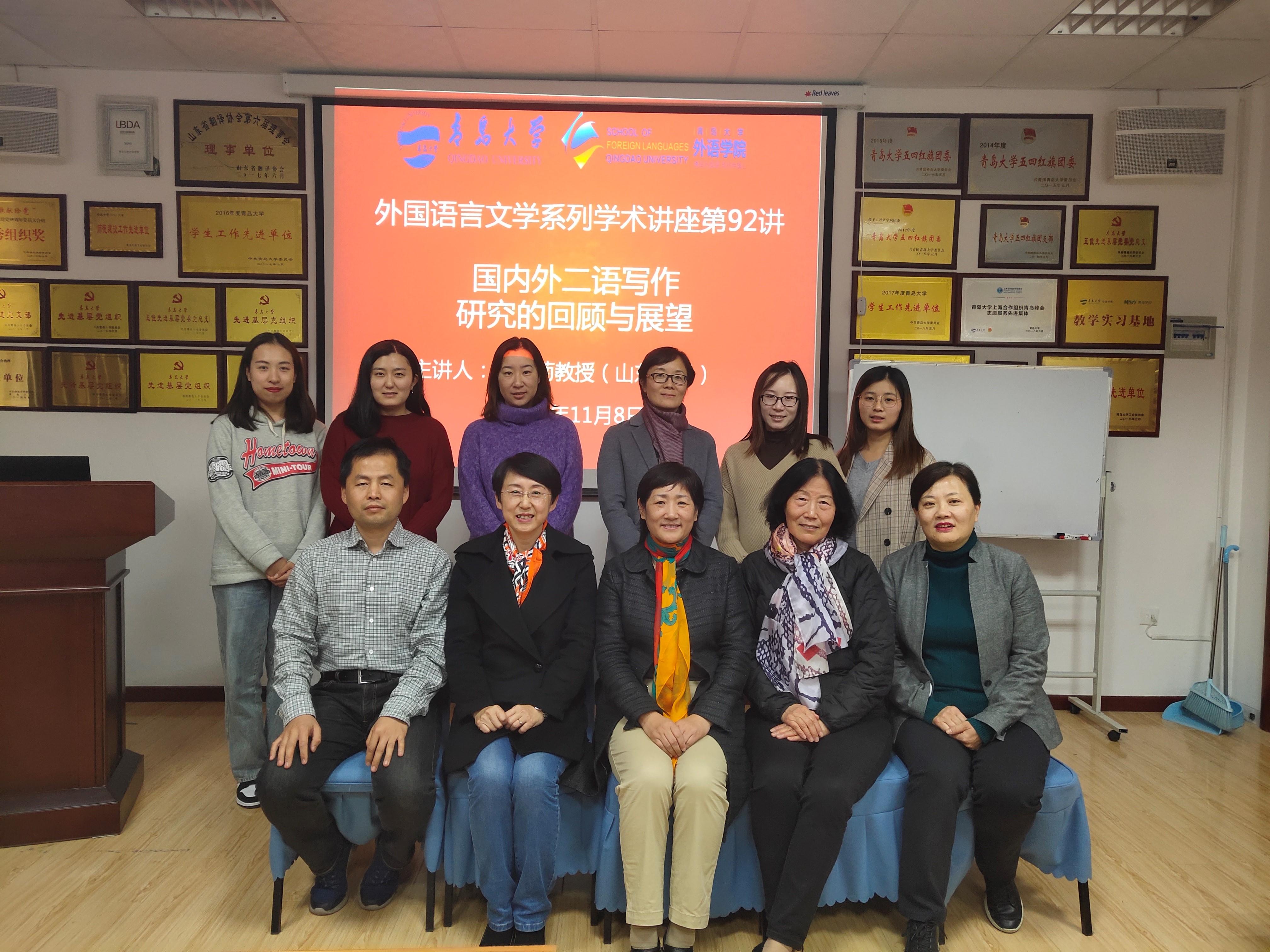 2019年11月8日,山东大学特聘教授王俊菊在博文楼312室为Beat365唯一官方网站师生带来了题为“国内外二语写作研究的回顾与展望”的精彩学术讲座。此次讲座由Beat365唯一官方网站院长卞建华主持,Beat365唯一官方网站副院长布占廷以及孙旻、王曼等老师和Beat365唯一官方网站部分学生出席了讲座。