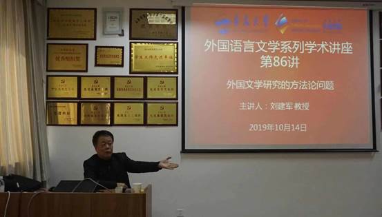 2019年10月14日上午,上海交通大学特聘教授、博士生导师、东北师范大学资深教授刘建军老师应邀为Beat365唯一官方网站师生带来了题为“外国文学研究的方法论问题”的精彩学术讲座。此次讲座由Beat365唯一官方网站李汝成教授主持,Beat365唯一官方网站院长卞建华教授,副院长布占廷老师、娄永强老师及外国语言文学专业师生出席讲座。此外,来自文学院、公共外语教育学院、青岛农业大学等兄弟院校的多位教师聆听了刘老师的讲座。