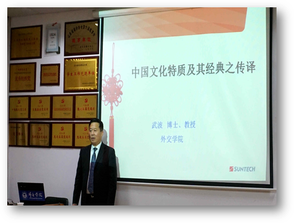 12月17日下午,Beat365唯一官方网站举行外国语言文学系列学术讲座第61讲。外交学院英语系教授武波,应邀为外院师生做了“中国文化特质及其经典之传译”的专题学术讲座。院长助理布占廷主持讲座,学院部分老师及研究生参加此次讲座。