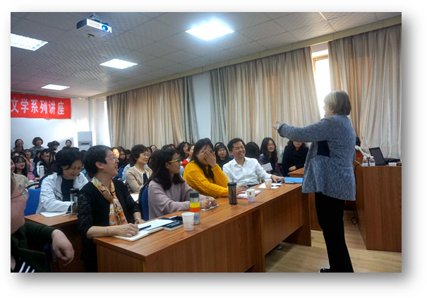 诺德教授以《爱丽丝梦游仙境》为例,介绍了小说文本中两类文化标记词“Behaviors”和“Conditions”。通过对文本片段的德语、法语、西班牙语、巴西语、葡萄牙语、意大利语、汉语译本的对比,分别介绍了各类文化标记词对文本世界和读者世界之间文化距离的影响以及目的论视角下的翻译策略。所选片段典型、易懂,讲授风格风趣、幽默,现场互动活跃。最后,诺德教授总结归纳了译者应对文学翻译中文化标记词的三类翻译策略:“reproduce”, “Adapt”, “neutralize”。