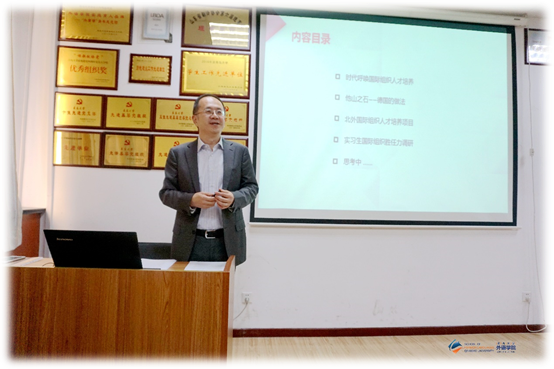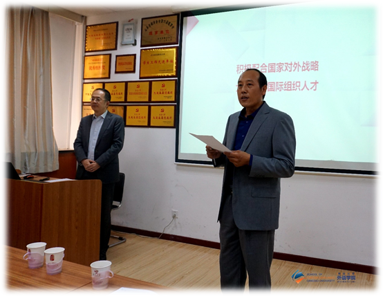 10月12日下午,北京外国语大学贾文键教授应Beat365唯一官方网站邀请,做客外国语言文学系列学术讲座第51讲,在博文楼312会议室作题为“积极配合国家对外战略,大力培养国际组织人才”的学术讲座。讲座由德语系系主任綦甲福教授主持,学院60余名师生聆听了讲座。