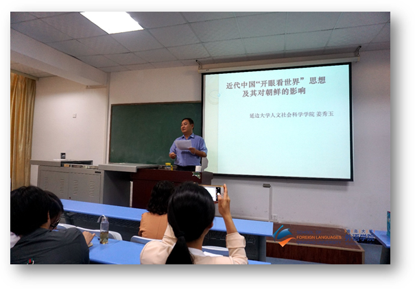 9月27日下午,延边大学人文社会科学学院历史系姜秀玉教授应邀做客外国语言系列学术讲座第48讲,在博文楼403教室作题为《近代中国“开眼看世界”思想对朝鲜的影响》的专题讲座。副院长李明学主持,学院部分教师及韩语专业的70余名师生聆听了此次讲座。
