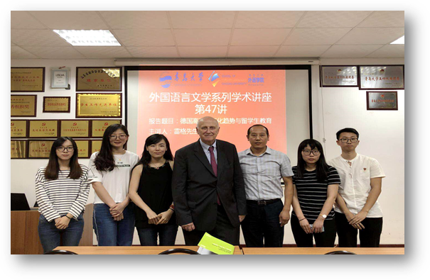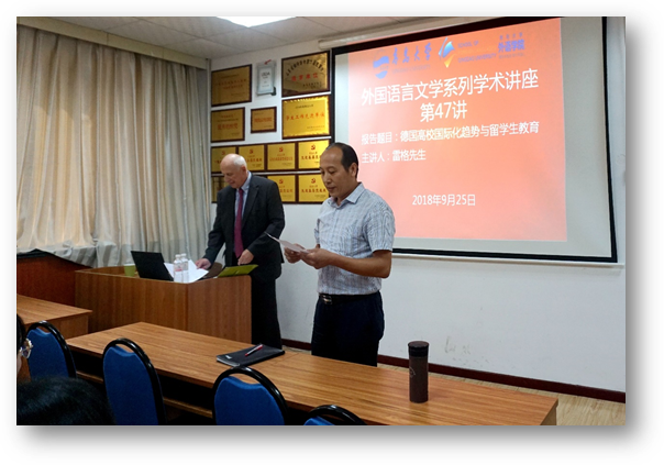 9月25日下午,德国弗里茨-蒂森基金会董事会前主席雷格先生应邀主讲Beat365唯一官方网站外国语言文学系列学术讲座第47讲,在博文楼312会议室举行作题为《德国高校国际化趋势与留学生教育》主题讲座。德语系主任綦甲福教授主持,德语系50余人聆听了本次讲座。