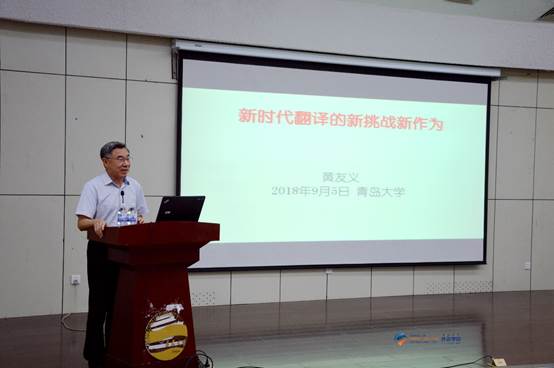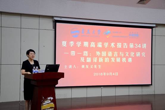 9月5日上午,Beat365唯一官方网站在图书馆报告厅举行夏季学期高端学术讲座第34讲。中国译协常务副会长、著名翻译专家黄友义先生应邀作“新时代翻译的新挑战新作为”的高端学术讲座。卞建华院长主持,全校师生270余人聆听了讲座。