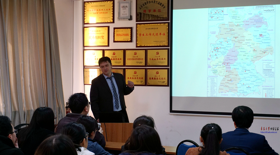 3月30日,德国拜罗伊特大学马库斯•慕尔尼克博士应邀做客外国语言文学系列学术讲座第33讲,并作《法兰肯区的拜罗伊特市——不只是边疆女伯爵威廉娜和音乐家瓦格纳》专题学术报告。院长助理布占廷主持讲座。