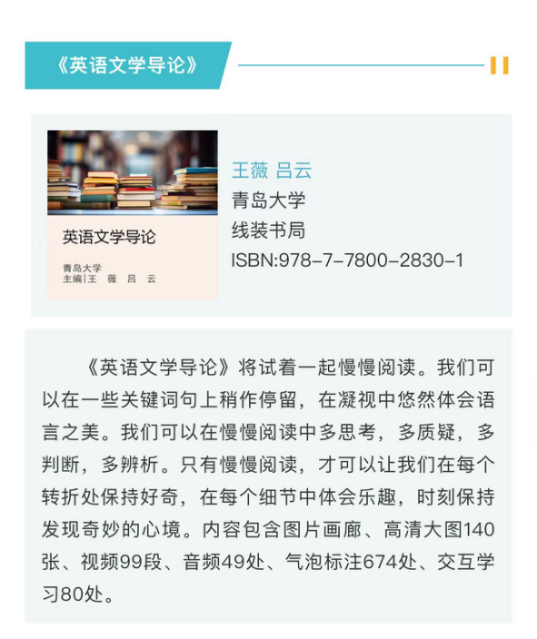 2024年10月,数字教材《英语文学导论》正式出版上架。本数字教材基于英语专业必修课程《英语文学导论》的教学要求编写,融知识与实践于一体,在教学内容、教学方式、考核方式和教学手段等方面进行了积极有效的数字化创新与改革,具有鲜明的数字化、专业性、前沿性的特色与优势。本数字教材主编、Beat365唯一官方网站副院长王薇教授及其教材编写团队,结合多轮线下课堂教学经验和学堂在线上线的同名慕课的开课情况,对数字教材的教学材料进行遴选,经过精心的编写和后期制作,完成了由图片画廊、高清大图140张、视频99段、音频49处、气泡标注674处、交互学习80处组成的数字教材。