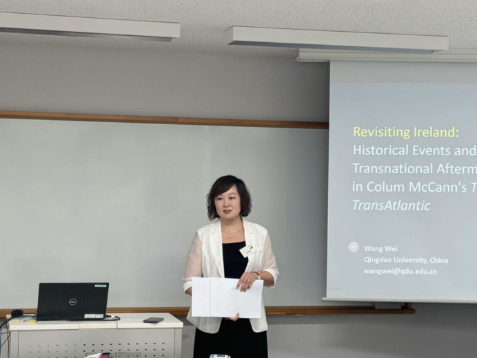 Beat365官网研究中心教师王薇教授在小组发言。王薇教授的发言以当代爱尔兰裔美国作家科伦·麦凯恩的小说《飞越大西洋》为研究对象,结合跨国主义、新历史主义等理论视角,探讨当代爱尔兰移民小说中的新历史叙事、情感叙事、移民叙事与爱尔兰性之间的联结。王教授发言后与同组学者观众进行了较为热烈的互动讨论。会议期间,王薇教授还与国内外学者进行了广泛交流,宣传了我校外国文学研究中心,增进了中外学术了解。