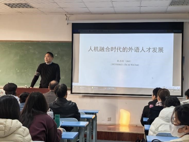 12月21日上午,华为翻译中心创始主任陈圣权老师聚焦“人机融合时代的外语人才发展”主题,全方位呈现了人机融合背景下外语人才发展的诸多机遇与行业前沿信息。陈老师首先以华为概况为引,展现华为于全球科技前沿的雄厚实力,进而深入介绍华为翻译团队。他指出,绿色低碳与数智化浪潮正重塑世界,语言服务行业面临新变革,人机融合乃大势所趋,而华为已率先探索。在谈及人才的“选、用、育、留”时,陈老师详细阐述华为的多渠道招聘策略,引导人才从单纯翻译角色向技术翻译转变。在人才发展方面,陈老师提出未来要打造强劲语言文化竞争力,培育高端译员与复合型语言人才。此外,他还分享了AI在华为翻译中的实践应用,并抛出人工智能是否为可靠“智能”的深刻思考,为学子们在人机融合时代的外语学习与职业规划指明方向,带来无限启迪。