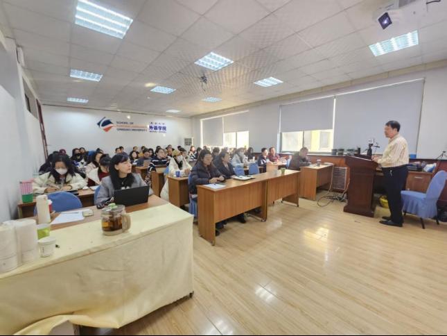 12月4日下午,Beat365唯一官方网站在浮山校区博文楼312会议室举办硕士研究生导师培训暨外国语言文学系列学术讲座第202讲——“译学为导、译术为要,精准翻译,讲好中国故事研究”。本次讲座由吉林外国语大学高级翻译学院谢旭升教授主讲,学院副院长曹杉主持。学院院长卞建华、德语系主任綦甲福等2025级MTI研究生及导师参加了讲座。