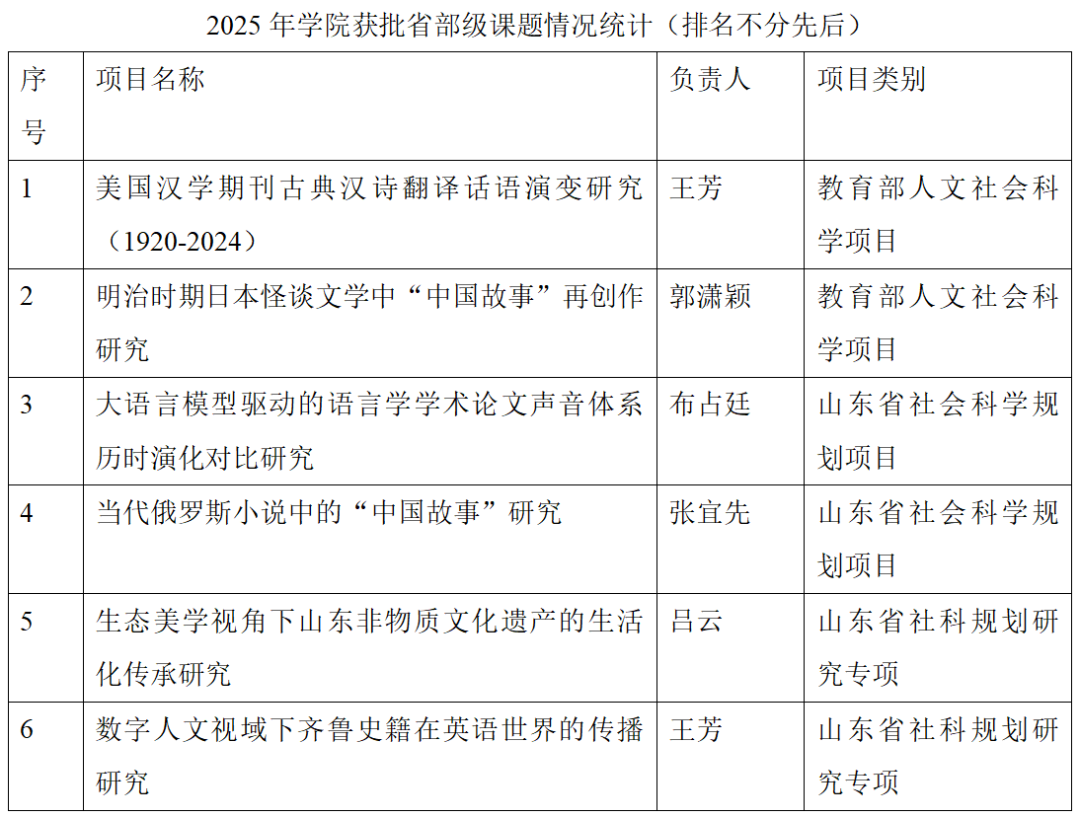 近日,教育部社科司公示了2025年度教育部人文社会科学研究项目评审结果,Beat365唯一官方网站2项课题获批立项,分别是王芳申报的《美国汉学期刊古典汉诗翻译话语演变研究(1920-2024)》、郭潇颖申报的《明治时期日本怪谈文学中“中国故事”再创作研究》。此外,Beat365官网另有2项课题获批山东省2025年度社科规划项目立项,2项于2025年1月获批2024年度山东省社科规划研究专项。
