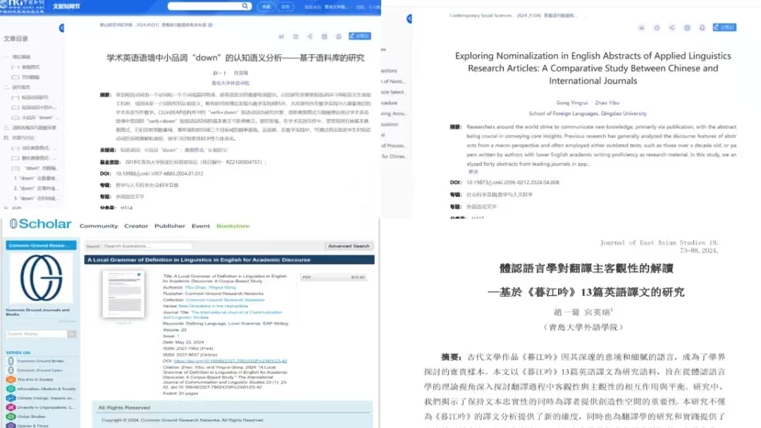 在导师认知语言学与文体学方向研究的影响下,我逐步确立了以认知语言学为理论基础,融合心理语言学实验、语篇分析、翻译研究与语料库实证方法的研究视角,尝试从语言现象中挖掘认知规律,并将其服务于教学与实践。围绕这一研究路径,导师与我合作开展多项实证研究:我们在AMI期刊 Contemporary Social Sciences上发表了关于中外应用语言学期刊摘要中名词化策略对比的研究,揭示了文化背景对学术表达方式的深层影响。我们基于语料库研究定义句的局部语法模型,补充并完善了既有的定义标记系统,为学术英语写作的教学与研究提供了结构化路径,相关成果发表在Scopus-Q3期刊 The International Journal of Communication and Linguistic Studies上。此外,我们将体认语言学视角引入古典诗歌翻译研究,探讨译者在主客观性之间的动态调节;同时也关注认知语义与教学实践的结合,以“down”为例分析其在学术语篇中的图式结构与隐喻路径,为词汇教学提供理论支持。