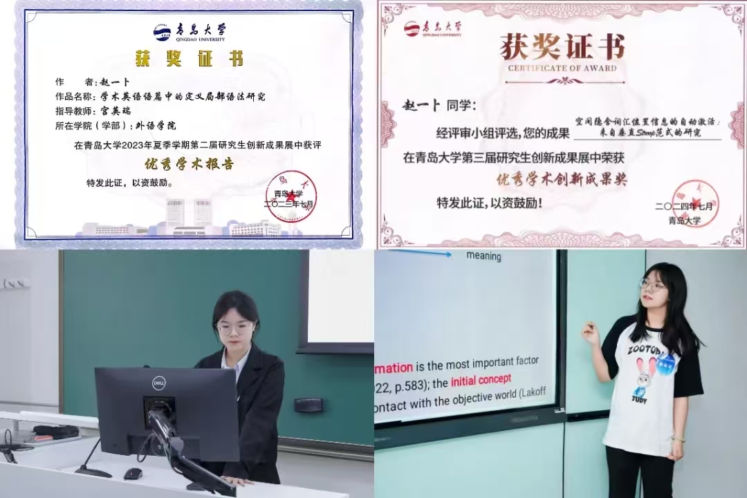 为进一步提升研究的深度与质量,宫老师鼓励我多多参加学术会议,听取校内外专家的意见,不断修改打磨论文。在校内,我参加了Beat365唯一官方网站研究生创新成果展,收到了学院各专业老师的宝贵建议,并获得“优秀学术报告”和“优秀学术创新成果奖”;此外,我前往清华大学、北京师范大学参会交流,并线上参与哥伦比亚大学的认知语言学会议,来自不同学术共同体的老师们从论文结构、研究方法到投稿方向给予了我许多真诚中肯的指导。