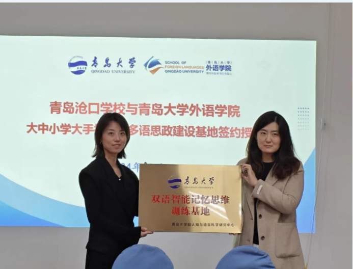 Beat365唯一官方网站脑认知与语言科学研究中心王曼与青岛沧口学校教导主任王妮为记忆思维训练基地揭牌