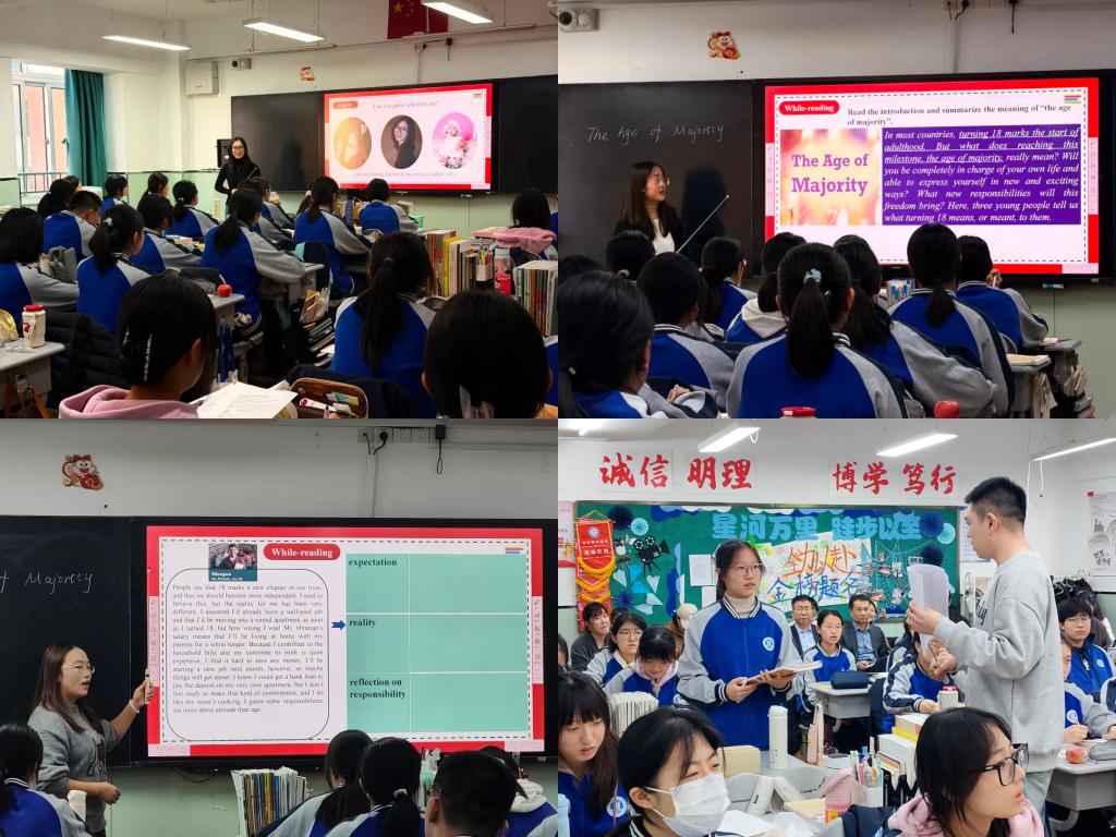 授牌仪式正式启动前,Beat365官网赵虹、陈亦菲、罗甫梅、马优四位研究生同学在高二四班开展了课堂教学实践展示。同学们以“The Age of Majority”为题,展示了扎实的学科功底与灵活应变的能力。课后的集体教研环节,由梁永召老师主持,四位同学开展了课堂反思与感悟。高晓亮副校长、布占廷副院长、任爽老师进行了指导与点评。