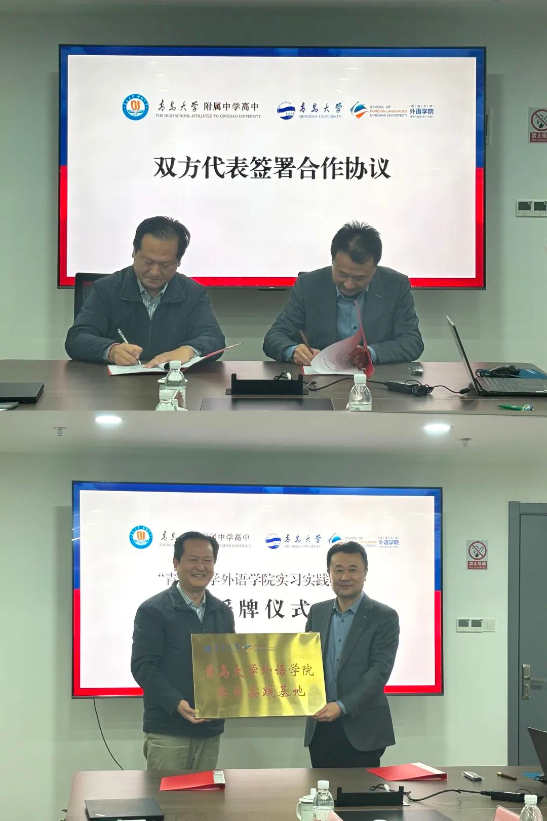 随后,进入协议签署与授牌环节。Beat365唯一官方网站党委书记陈崇研与青大附中高中校长张金堂作为双方代表,郑重签署合作协议。陈崇研书记向张金堂校长颁授Beat365唯一官方网站实习实践基地牌匾。