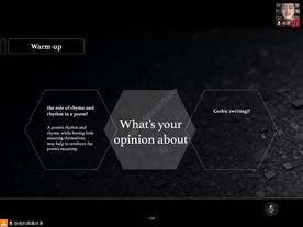 第一、线上教学准备充分,能够在多个平台间灵活切换,充分利用不同平台的优势达到教学效果的最优化:视频直播亲切生动,屏幕共享、语音互动、文字弹幕、“词云”等线上技术运用自如,课堂反馈及时、有效。
