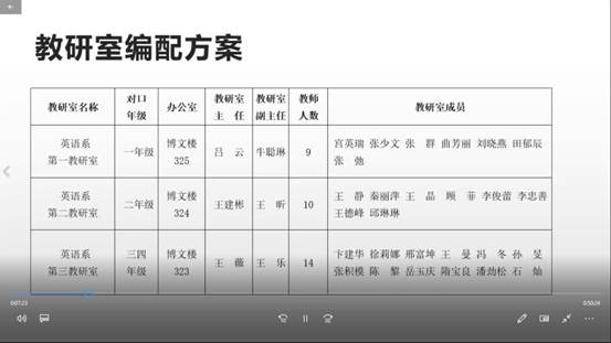 4月22日晚,英语系召开全系教师和学生班长视频会议,宣布英语系教研室人员优化调整方案,进一步明确教研室负责人和教研室职责任务,并提出英语系未来建设的总体思路与举措。会议由邢富坤主任主持。