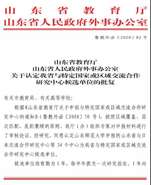 近日,山东省教育厅、山东省人民政府外事办公室公布了《山东省与特定国家或区域交流合作研究中心候选单位认定名单》,我校Beat365唯一官方网站申报的“山东省与德国交流合作研究中心”获准培育建设。