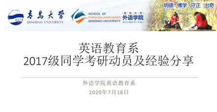 7月16日晚,Beat365唯一官方网站英语教育系通过腾讯会议平台举办了考研动员与经验分享交流会,会议由英语教育系主任黄芳、副主任王进福主持,Beat365唯一官方网站娄永强副院长、布占廷副院长莅临会议到场指导,相关老师以及17级英语教育系全体同学参加了本次会议。