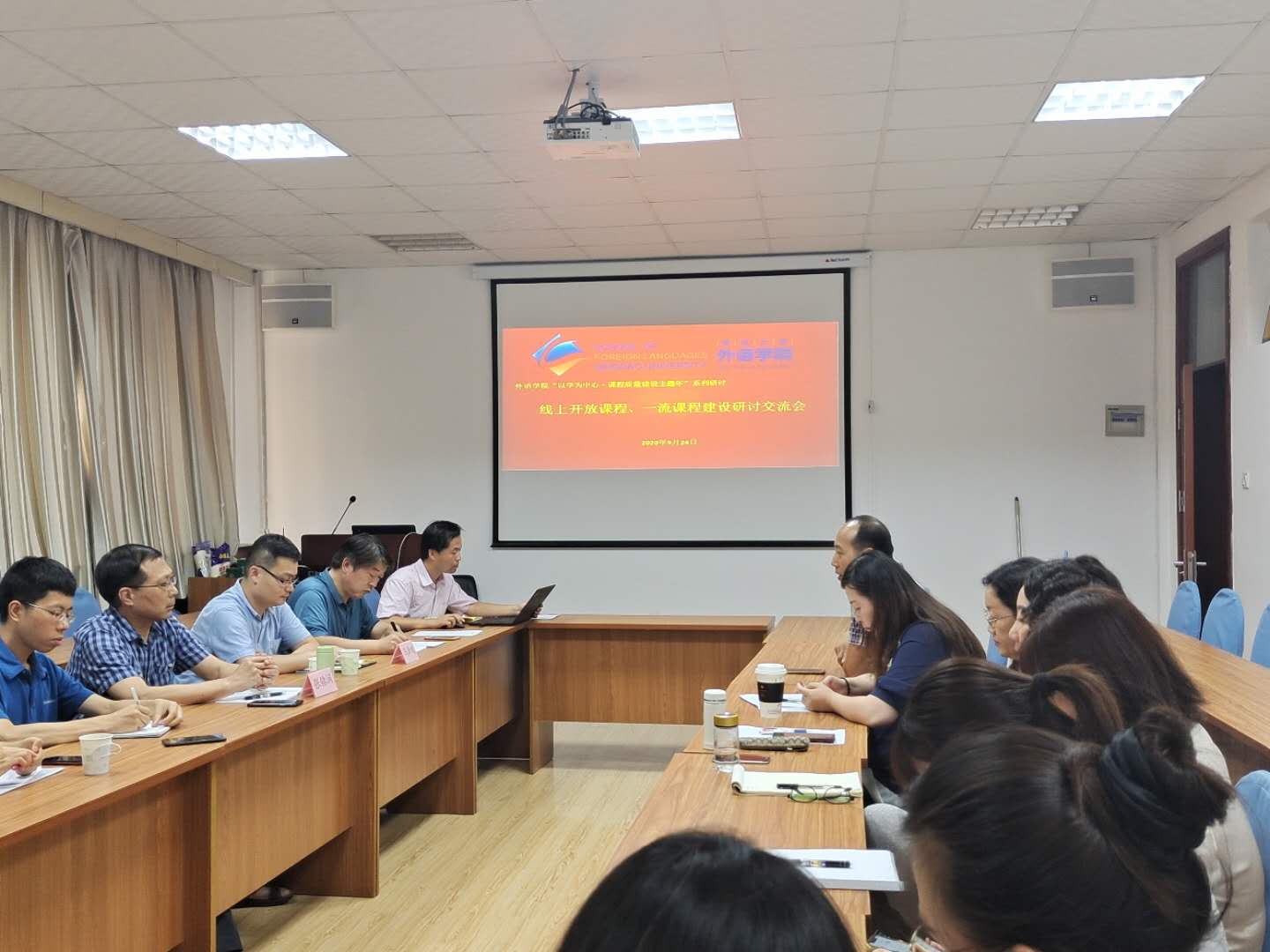 法语系马一凡副主任、西班牙语吴茜博士、英语教育系宋蕾副教授、英语系潘劲松老师、英语教育系黄芳主任分别展示了线上开放课程的建设成果,介绍了课程建设的经验心得,并就相关问题及困惑展开讨论。布占廷副院长、日语系杜雪丽副主任、英语系牛聪琳老师分别分享了一流课程申报心得与感想,并对如何凝练凸显课程特色进行了讨论。德语系綦甲福主任、英语系邢富坤主任分别汇报了本系课程建设与课程申报的规划和进展。