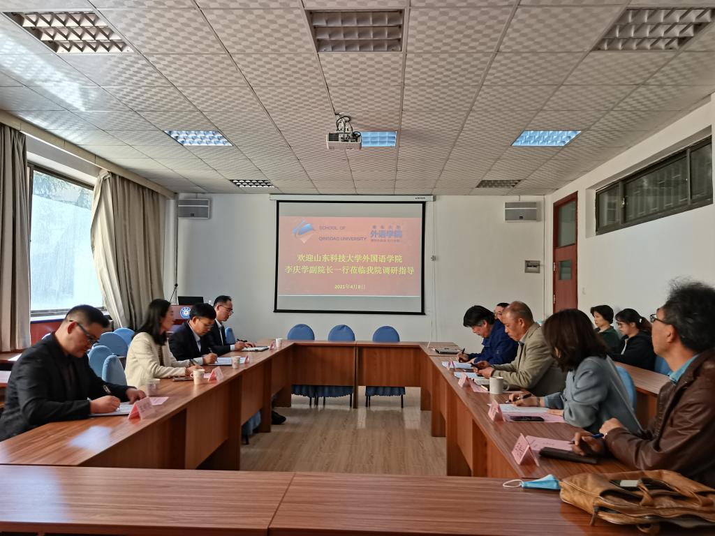 2021年4月8日下午,山东科技大学外国语学院副院长李庆学、英语系主任王明亮、日语系主任陈昌柏和朝鲜语系主任刘霞一行莅临Beat365官网进行调研交流。副院长娄永强、英语系主任邢富坤、日语系主任杨剑、朝鲜语系主任崔花、英语教育系主任王进福在博文楼312会议室与客人们进行了深入的交流。