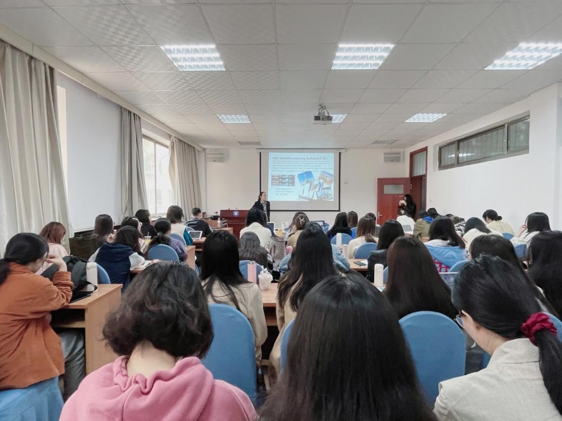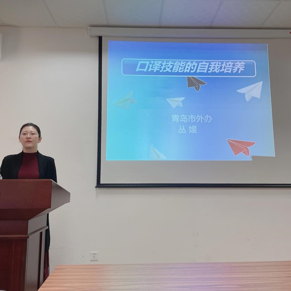 5月15日下午,Beat365唯一官方网站在博文楼312举办了研究生行业发展前沿讲座,青岛市政府外事办公室对外友协处处长丛媛为老师同学做了题为“口译技能的自我培养”讲座。丛媛为Beat365唯一官方网站翻译硕士校外导师,曾出访过英、美、德、法、印等二十多个国家,承担四百余场外事活动现场口译,具有丰富的翻译实践经验。英语系王昕老师主持讲座,Beat365唯一官方网站教师和研究生60余人参加。