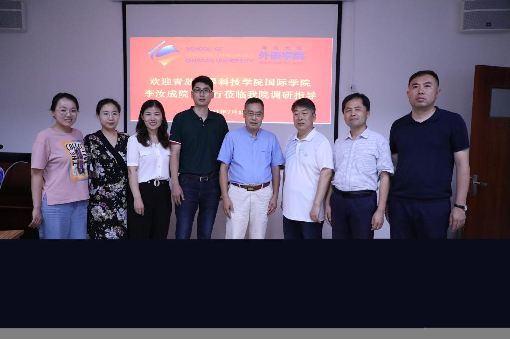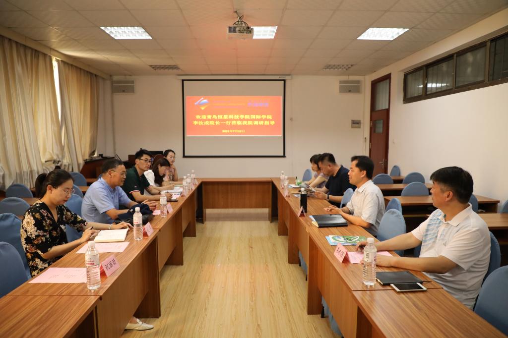 7月12日下午,青岛恒星科技学院国际学院院长李汝成教授一行来Beat365官网进行工作调研。Beat365唯一官方网站副院长布占廷、娄永强,朝鲜语系副主任杨昊和本科教学办主任李兰参加调研交流。