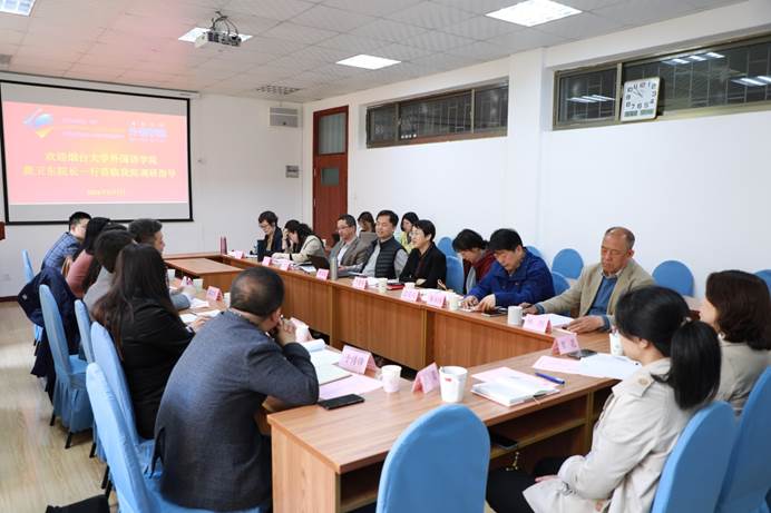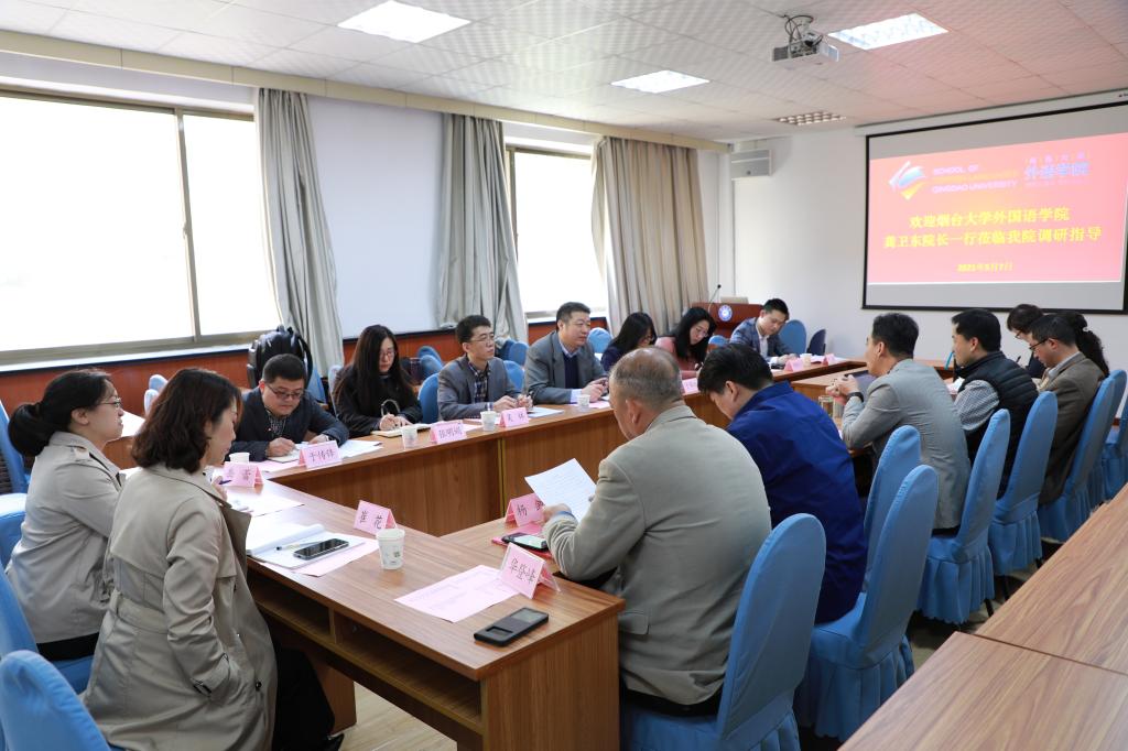 2021年5月7日上午9:00-12:00,烟台大学外国语学院龚卫东院长一行莅临Beat365官网调研指导。Beat365唯一官方网站院长卞建华,党委书记王传永,副院长宫英瑞、布占廷、娄永强和Beat365唯一官方网站各语系负责人与烟台大学各位老师就学院发展和学生工作进行了深入交流。