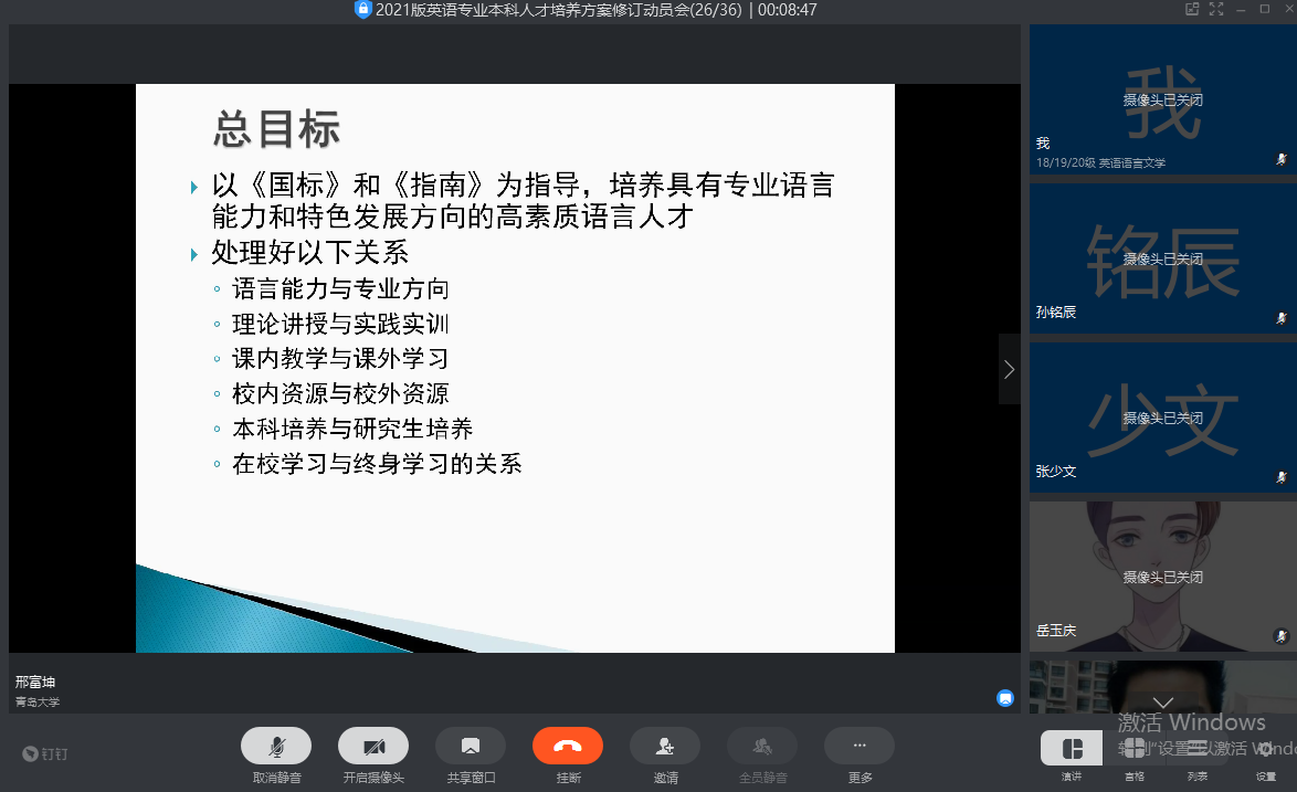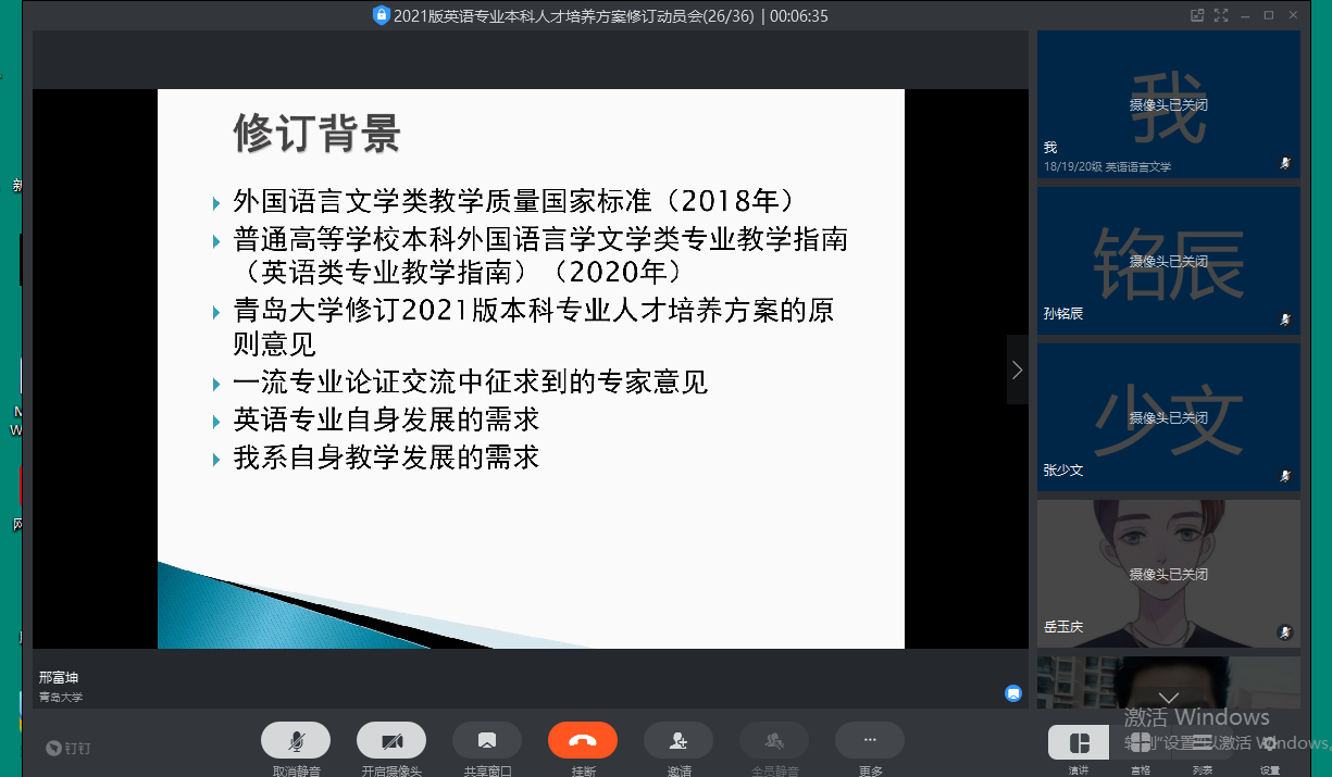 为做好英语专业本科专业人才培养方案的修订工作,落实教育部《英语类专业教学指南》与《Beat365唯一官方网站修订2021版本科专业人才培养方案的原则意见》,3月19日晚,英语系在线召开本科人才培养方案修订动员会,Beat365唯一官方网站院长卞建华参加,英语系全体教师出席会议,会议由英语系主任邢富坤主持。