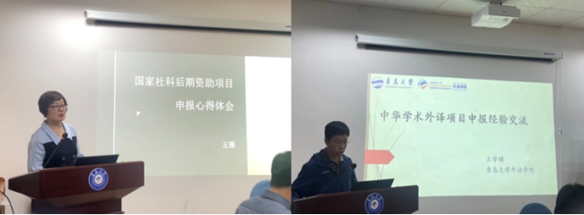 随后,李昌珂教授和崔花副教授对中华学术外译项目申报给出了建议。李昌珂指出,中华学术外译项目申报时要注重选择能够对外宣传国家软实力的书目。崔花从选题、联络、材料填报等环节介绍了宝贵经验。