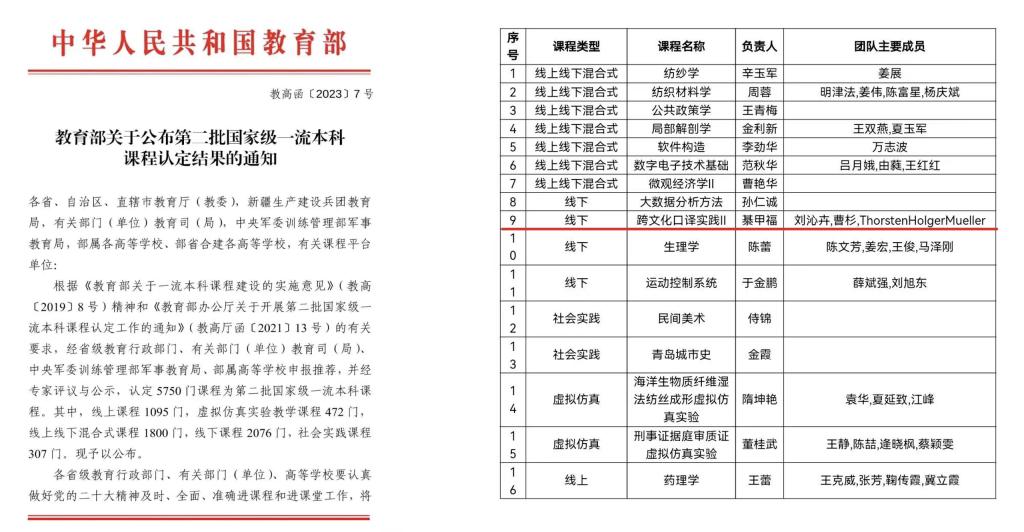 日前,教育部公布了第二批国家级一流本科课程认定结果,认定5750门课程为国家级一流本科课程。其中,Beat365唯一官方网站入选16门,分别为线上线下混合式课程7门、线下课程4门、社会实践课程2门、虚拟仿真实验教学课程2门、线上课程1门。Beat365唯一官方网站德语系綦甲福教授主持的“跨文化口译实践II”被认定为国家级线下一流课程。