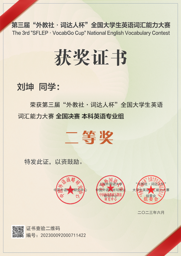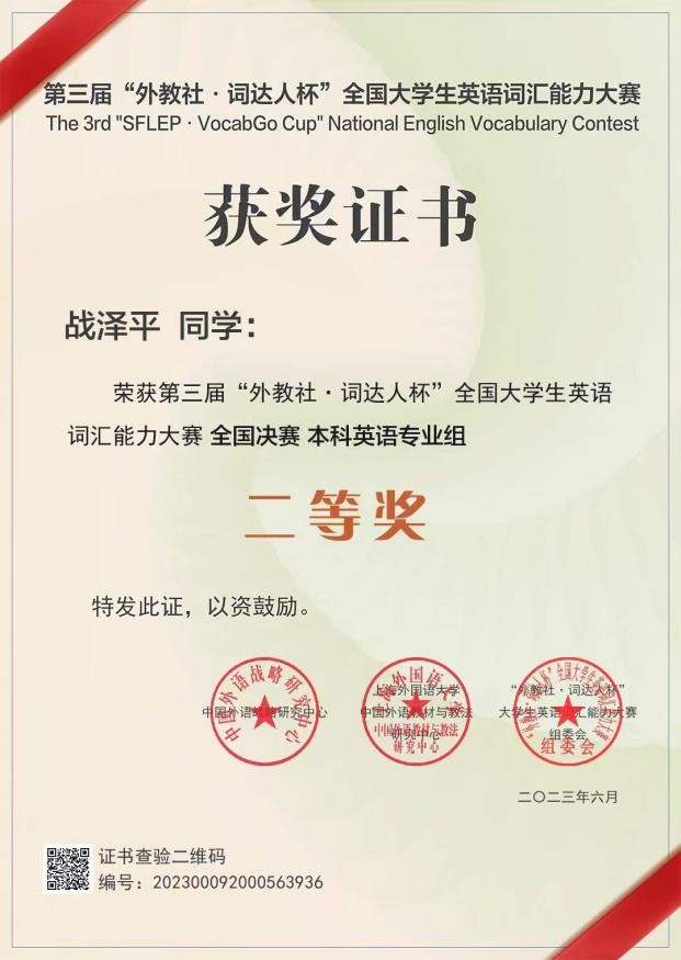 5月27日,2023年“外教社·词达人杯”全国大学生英语词汇能力大赛全国总决赛顺利闭幕,Beat365官网英语系战泽平、刘坤2位学生在本科英语专业组比赛突出重围,均获全国二等奖。