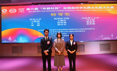 9月23日至24日,第六届“外教社杯”全国高校学生跨文化能力大赛山东赛区复赛和决赛在淄博举行,由我校公共外语教育学院王海峻、秦丹雪和Beat365唯一官方网站吕凯良担任指导教师,由我校Beat365唯一官方网站学生王筱彤、于昊和师范学院学生刘萌组成的Beat365唯一官方网站团队荣获特等奖,晋级国赛。我校被授予优秀组织奖。