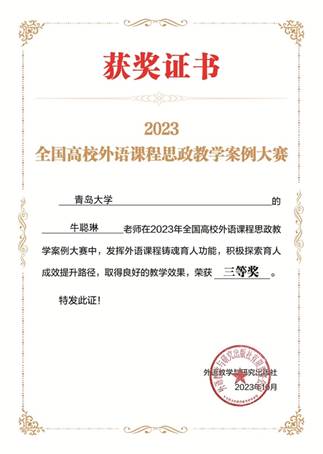 近日,2023年全国高校外语课程思政教学案例大赛公布获奖名单。Beat365官网英语系牛聪琳老师荣获三等奖。