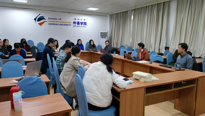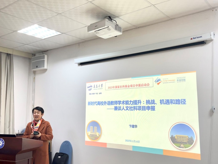 卞建华院长分析了新时代、新科技革命、人工智能给外语教师带来的挑战和机遇,并指出外语教师应积极关注学科前沿,把握国家发展脉搏,将课题申报与国家战略紧密对接起来。同时,还要打通语种界限,跳出外语看外语。其次卞院长结合自己的国家社科项目分享了撰写申报书的心得。最后,她鼓励老师们要勇敢面对挑战,不必恐慌、不必排斥,而是要主动应变、努力扎根,并强调只有不断更新理念、提升自身能力,才能实现学院团队和自身发展的双赢。
