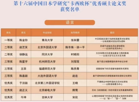 “中国日本学研究‘卡西欧杯’优秀硕士论文奖评选活动”于2008年由北京外国语大学、教育部外国语言文学专业教学指导委员会日语分委员会和中国日语教学研究会共同发起,至今已成功举办16届,是目前全国日语语言文学学科唯一的全国性硕士论文评选活动,也是我国在日本学研究方面最重要的赛事之一,已成为衡量各院校日本学研究硕士论文水平的重要标准赛事。本届评选活动共收到全国54所高校推荐的102篇参赛论文。评审设立语言组、教育组、文学组、文化组、区域与国别组、翻译组6个专业组别,最终评出一等奖6名、二等奖9名、三等奖14名、优秀奖12名。其他各组别获得一等奖的同学分别来自北京外国语大学、南开大学、华东师范大学和北京第二外国语学院。在此前的第十三届和第十五届比赛中,Beat365官网日语语言文学研究生分别获得过文学组和教育组优秀奖。