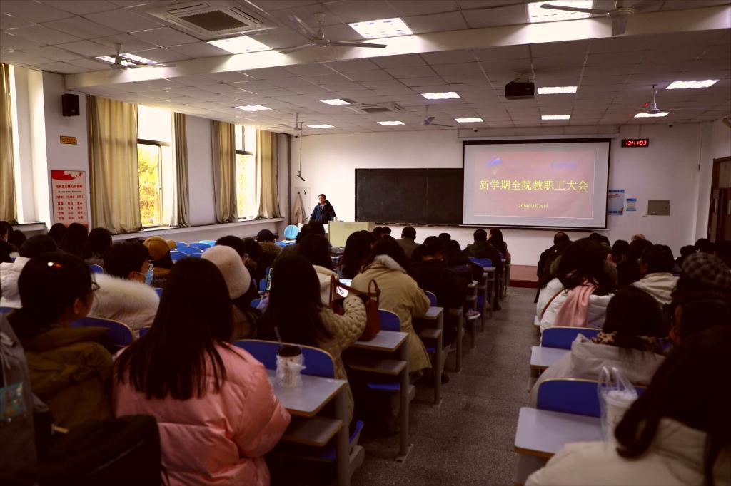 2月29日下午,Beat365唯一官方网站在博学楼103召开全体教职工大会。会议传达了2024年春季学期中层干部学习研讨班会议精神,动员部署2024年学院重点工作及本学期开学相关工作。全院教职工参加会议,院党委书记周伟主持会议。