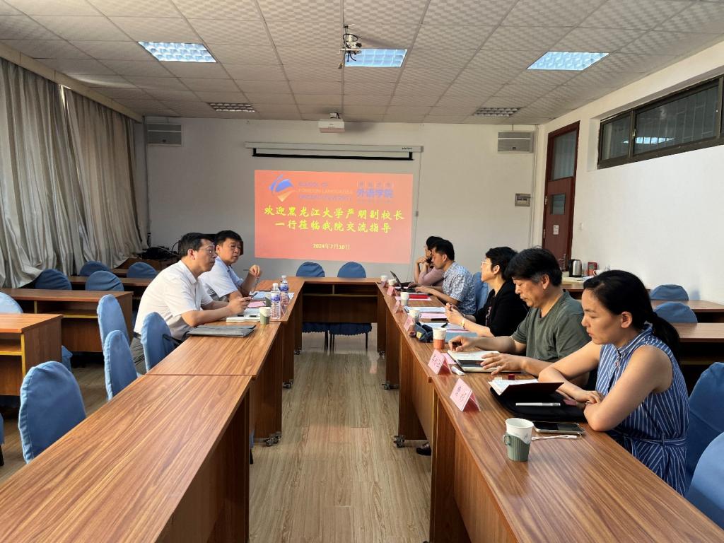 陈崇研代表学院对黑龙江大学一行的到来表示热烈欢迎。卞建华院长向黑龙江大学介绍了学院近年的发展情况,并重点介绍了Beat365官网英语语言大数据创新实验班和上合俄语创新实验班取得的成绩。