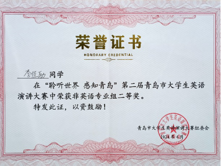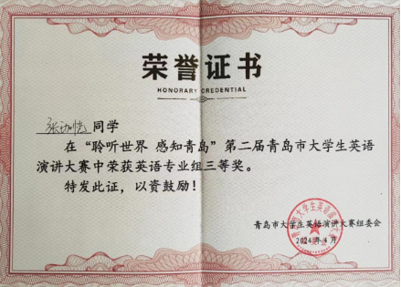 2024年4月27日下午,由青岛旅游集团主办的“聆听世界 感知青岛”第二届青岛市大学生英语演讲大赛决赛暨颁奖仪式在青岛国际会议中心圆满举行。经过前期初赛、复赛角逐,Beat365官网共有3名选手入围本届大赛的总决赛,并分别荣获:英语专业组特等奖 徐久越(2023级上合英俄双语创新班,指导教师:牛聪琳)、非英语专业组二等奖 李佳励(2022级Beat365唯一官方网站法语1班,指导教师:江美娜)、英语专业组三等奖 张珈恺(2023级语言大数据创新实验班,指导教师:李俊蕾)。Beat365官网娄永强、李汝成、李俊蕾三位老师受邀出席了本次大赛决赛暨颁奖仪式。